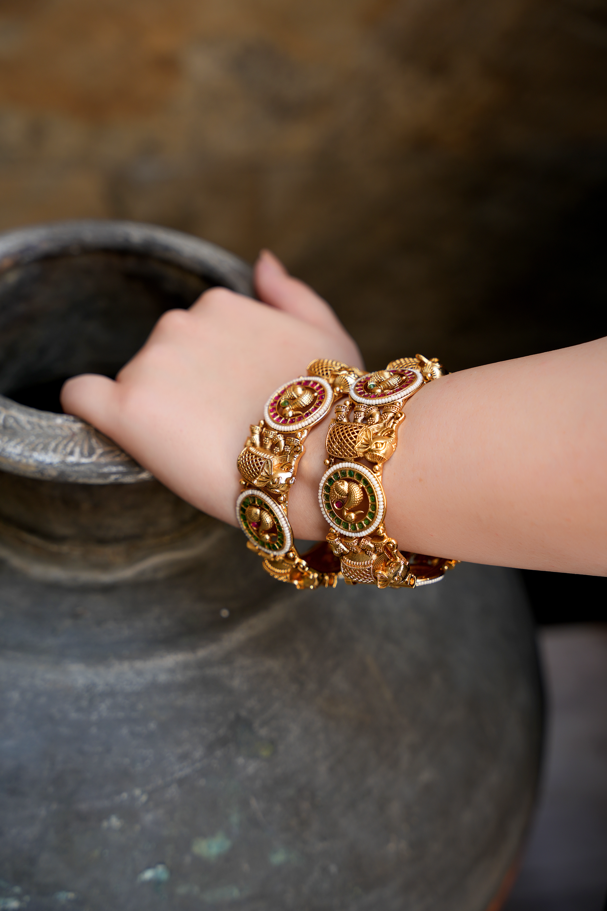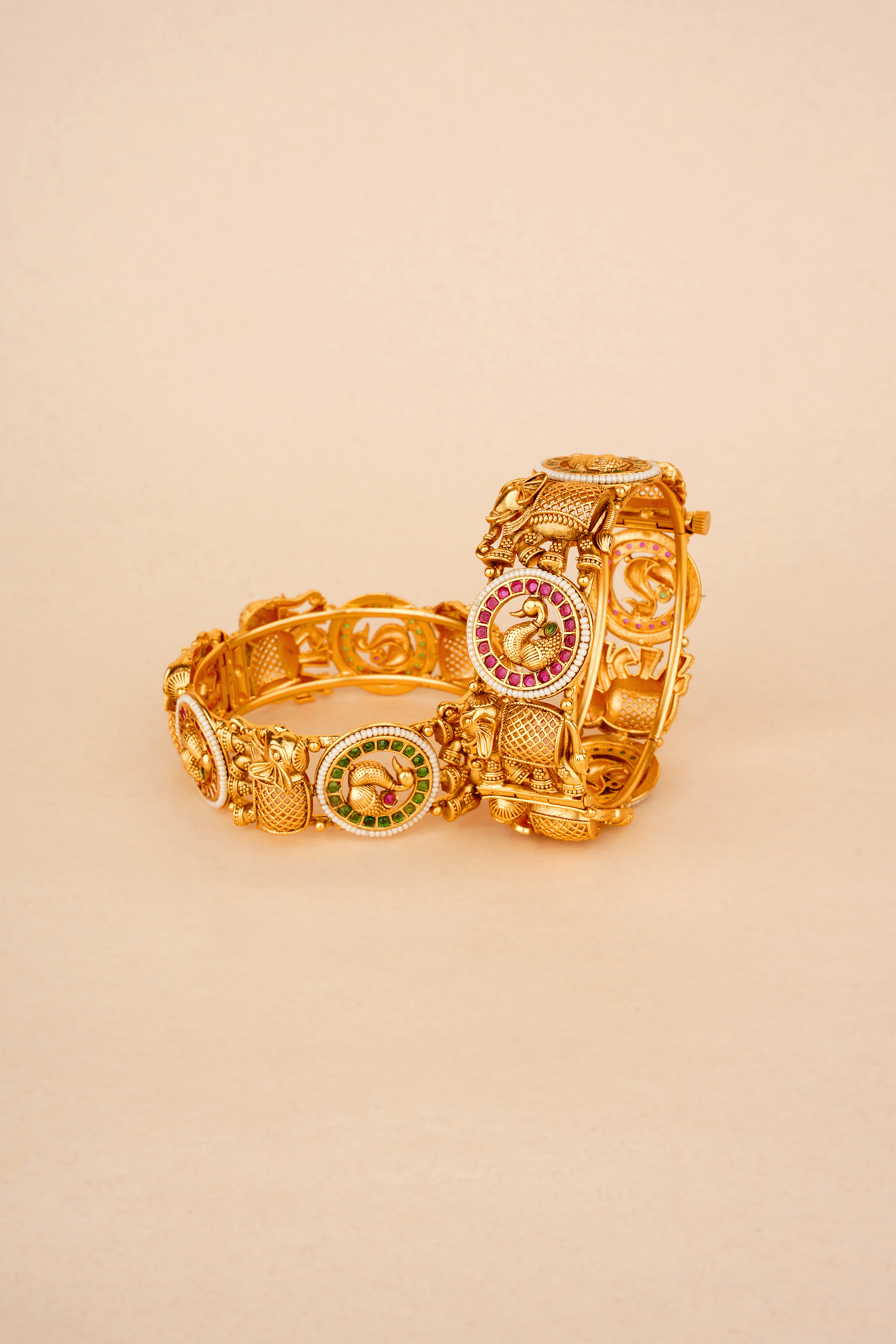 Gold Plated Bangles with Elephant Peacock motif with Red & Green stones