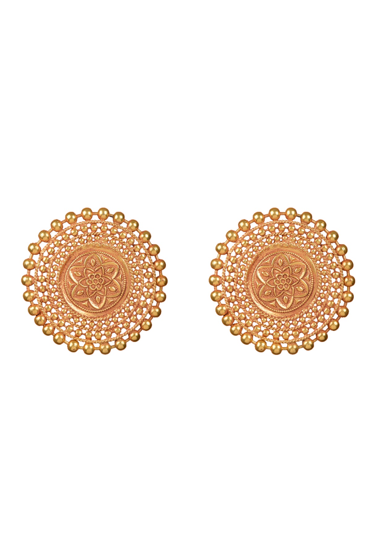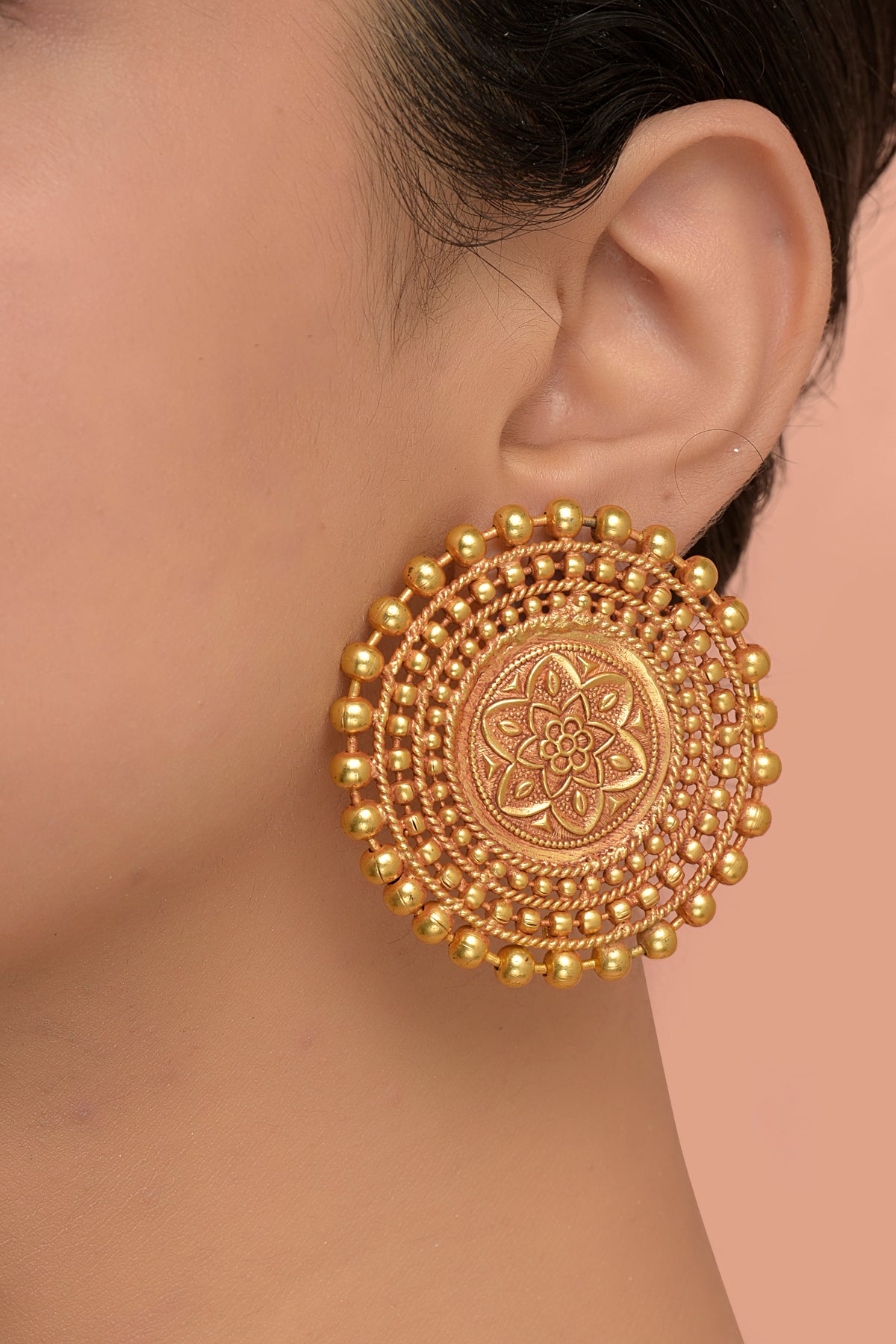 Featuring a pair of gold plated textured intricately carved disc earrings