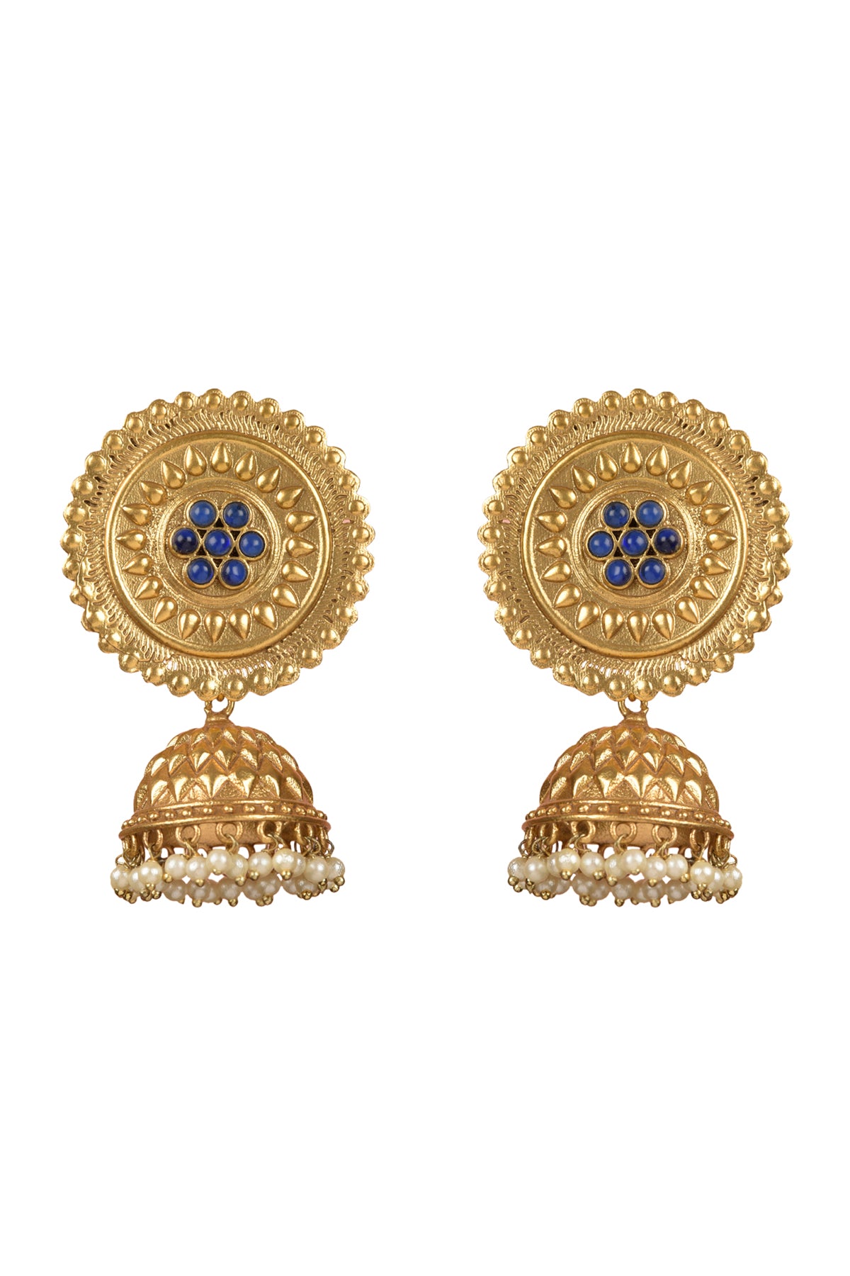 Featuring a pair of gold plated carved disc jhumka earrings studded with pearls and blue stones