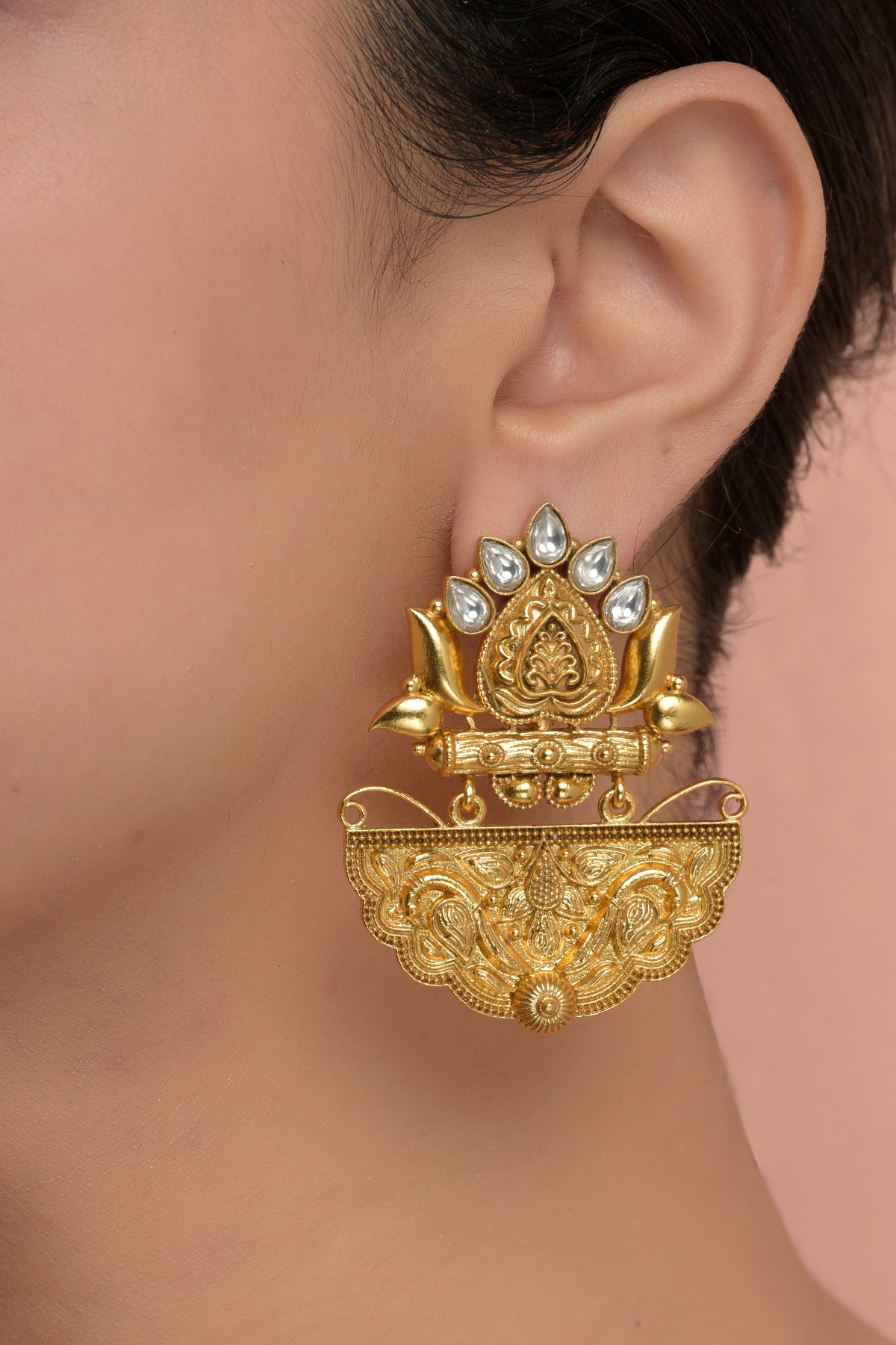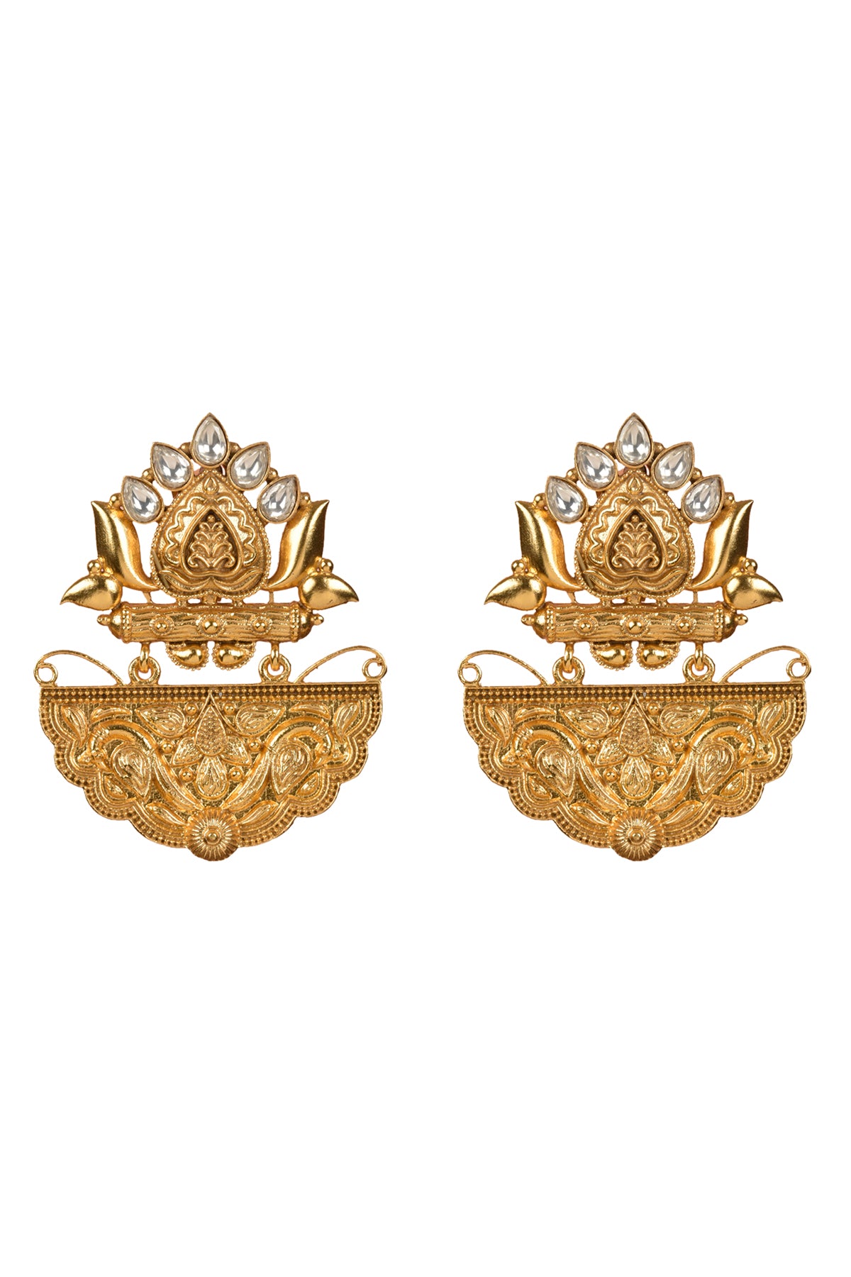 Featuring a pair of gold plated dangler earrings with a carved base kundan polki set in