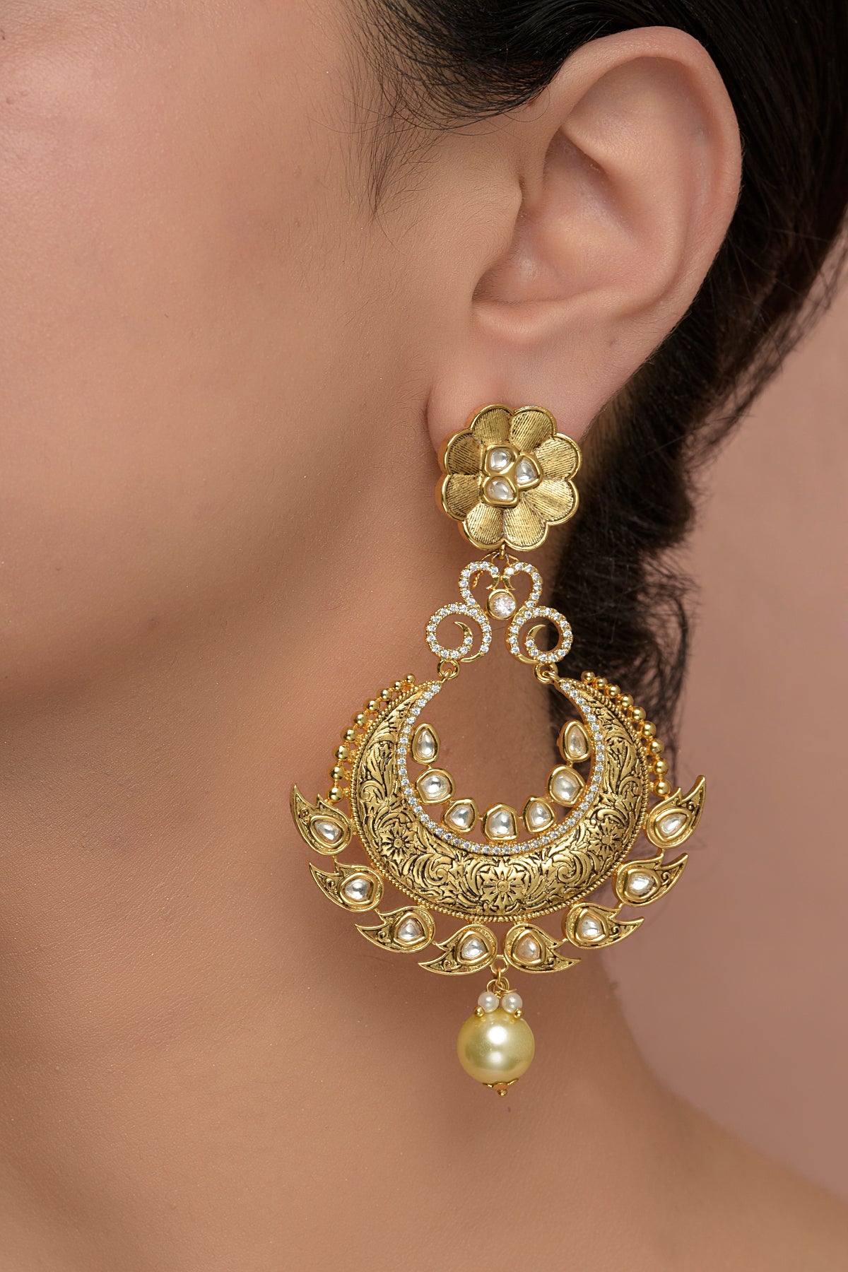 Gold Plated Carved Kundan Polki Chandbali Earrings