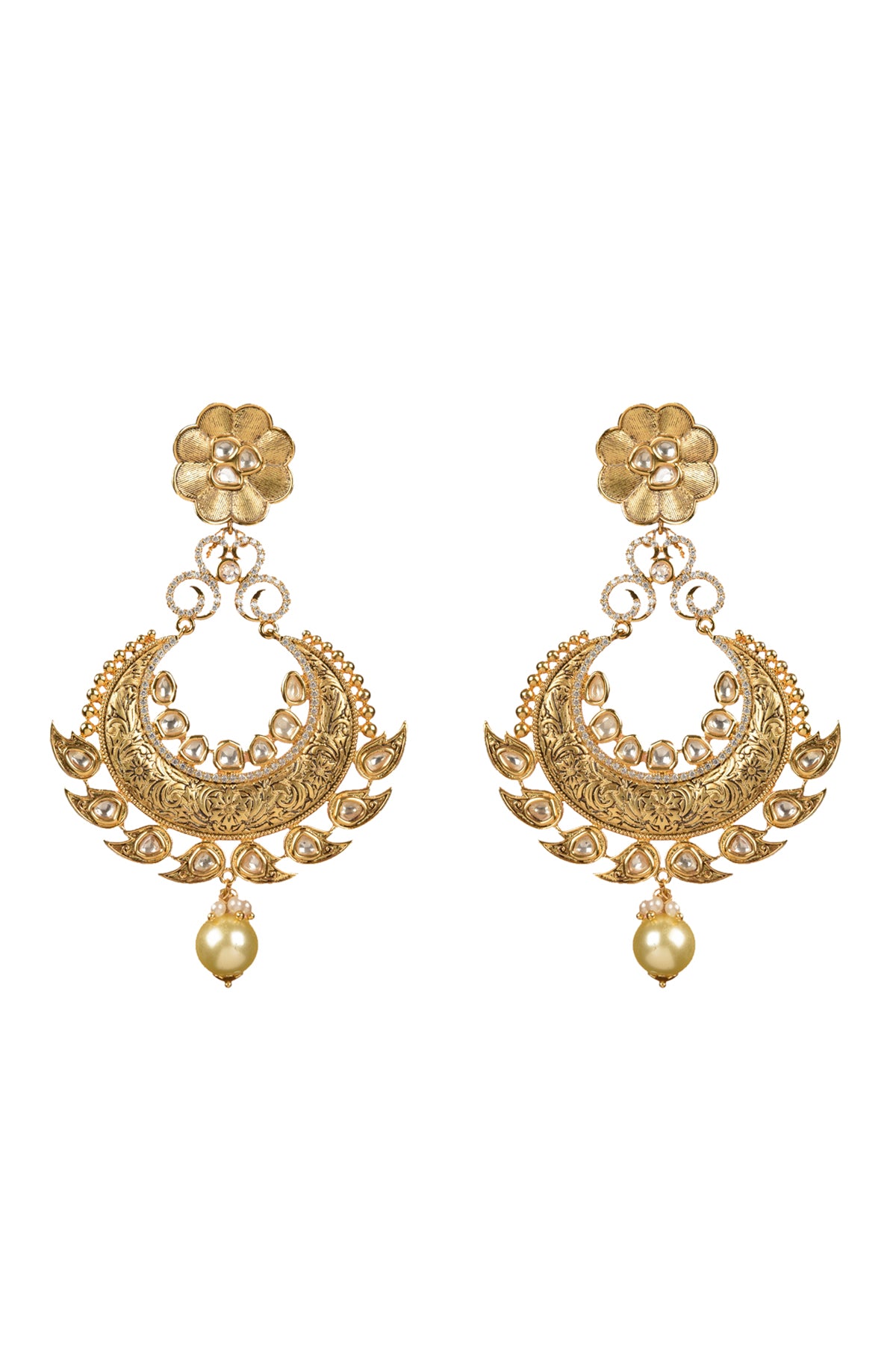 Featuring a pair of 24 Kt gold plated chandbali earrings studded with pearls and kundan polki