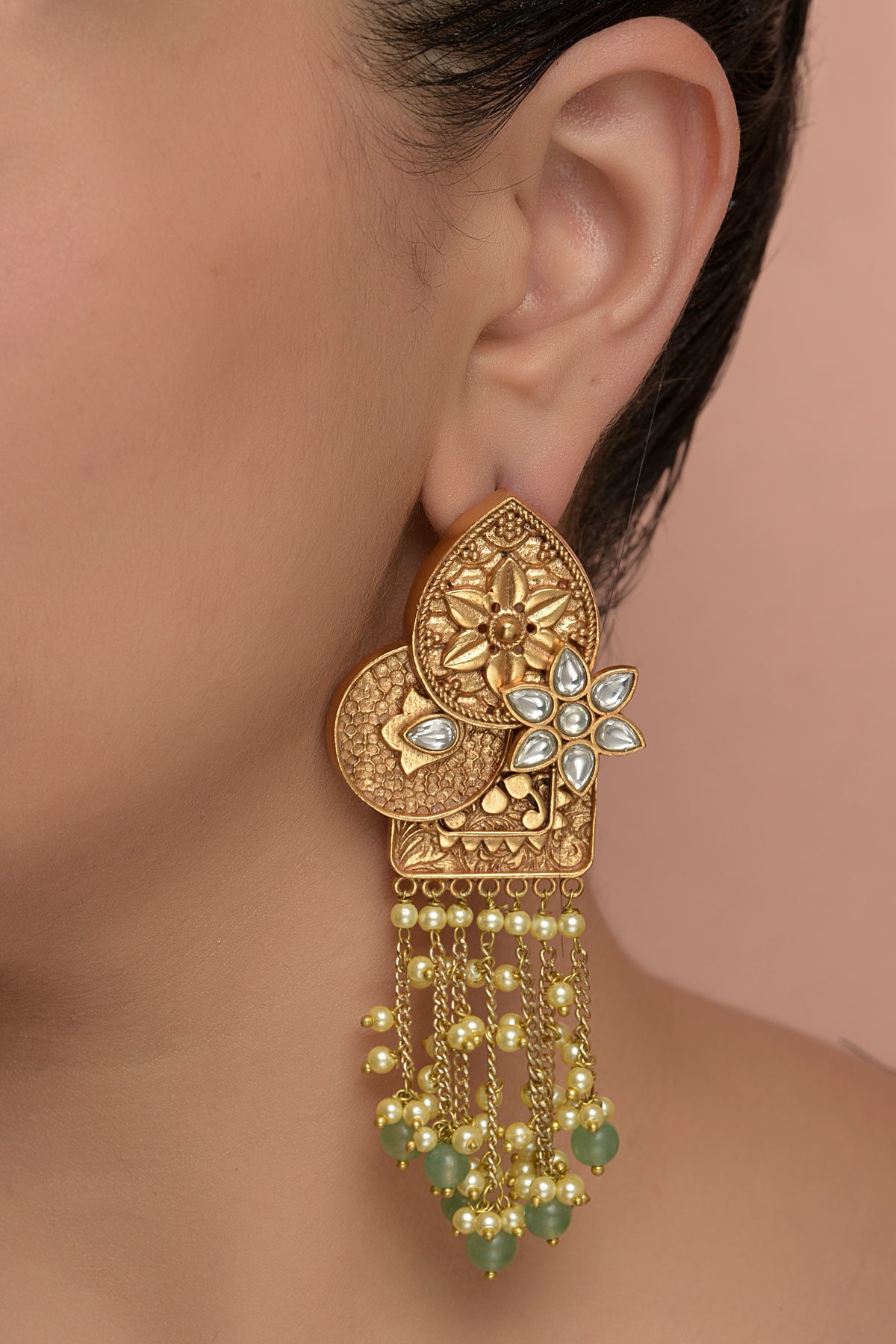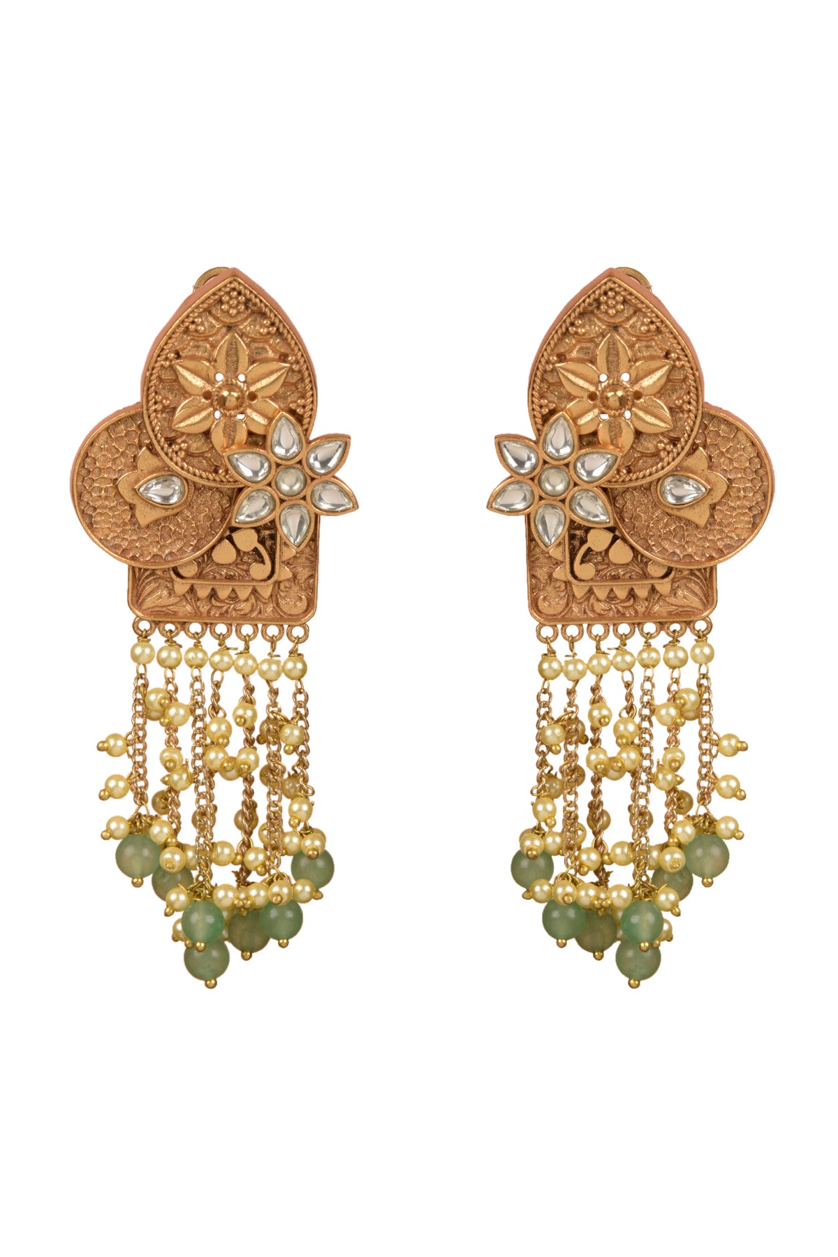 Featuring a pair of gold plated dangler carved earrings studded with kundan polki, hangings chains with pearls & stones