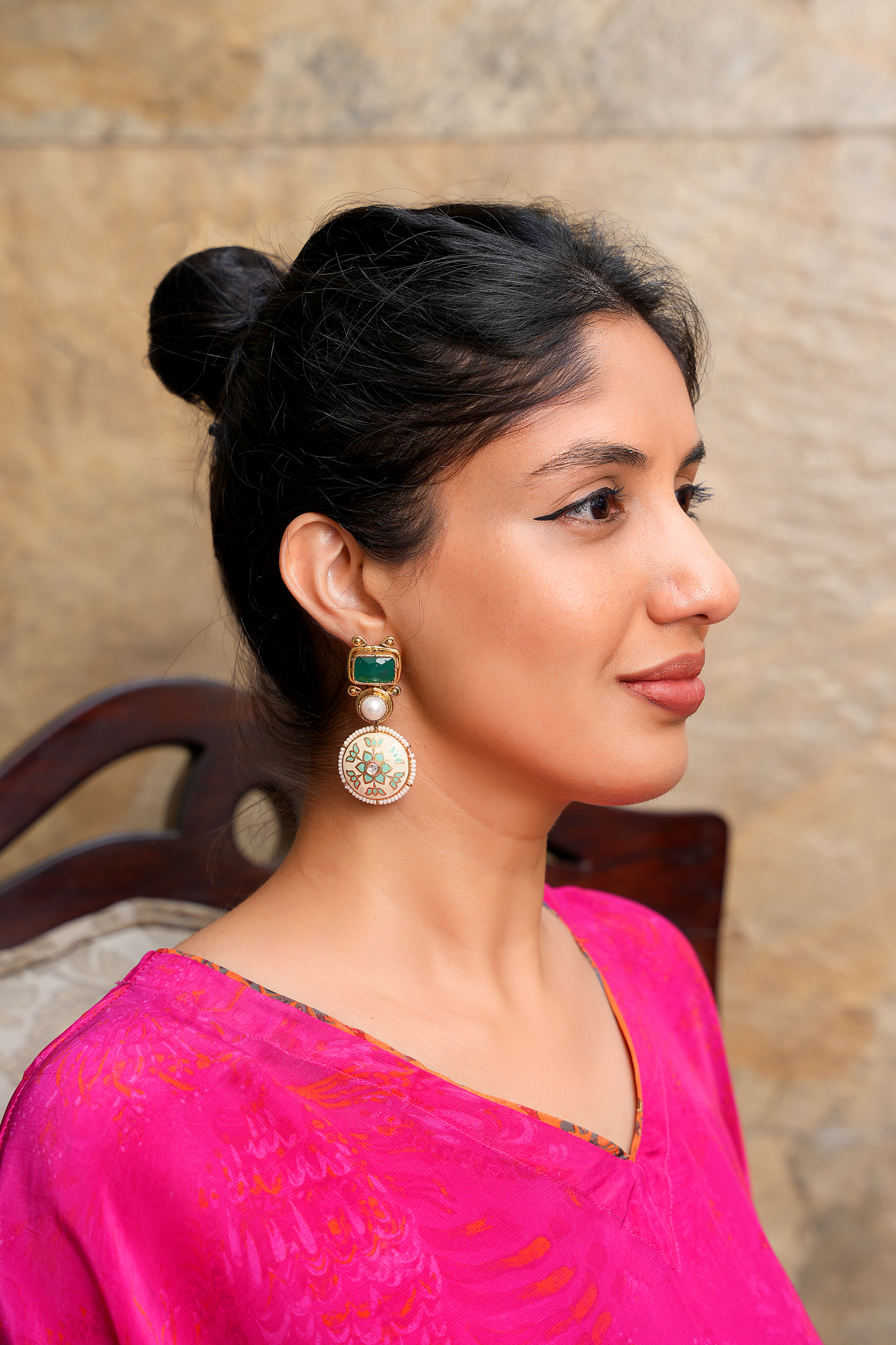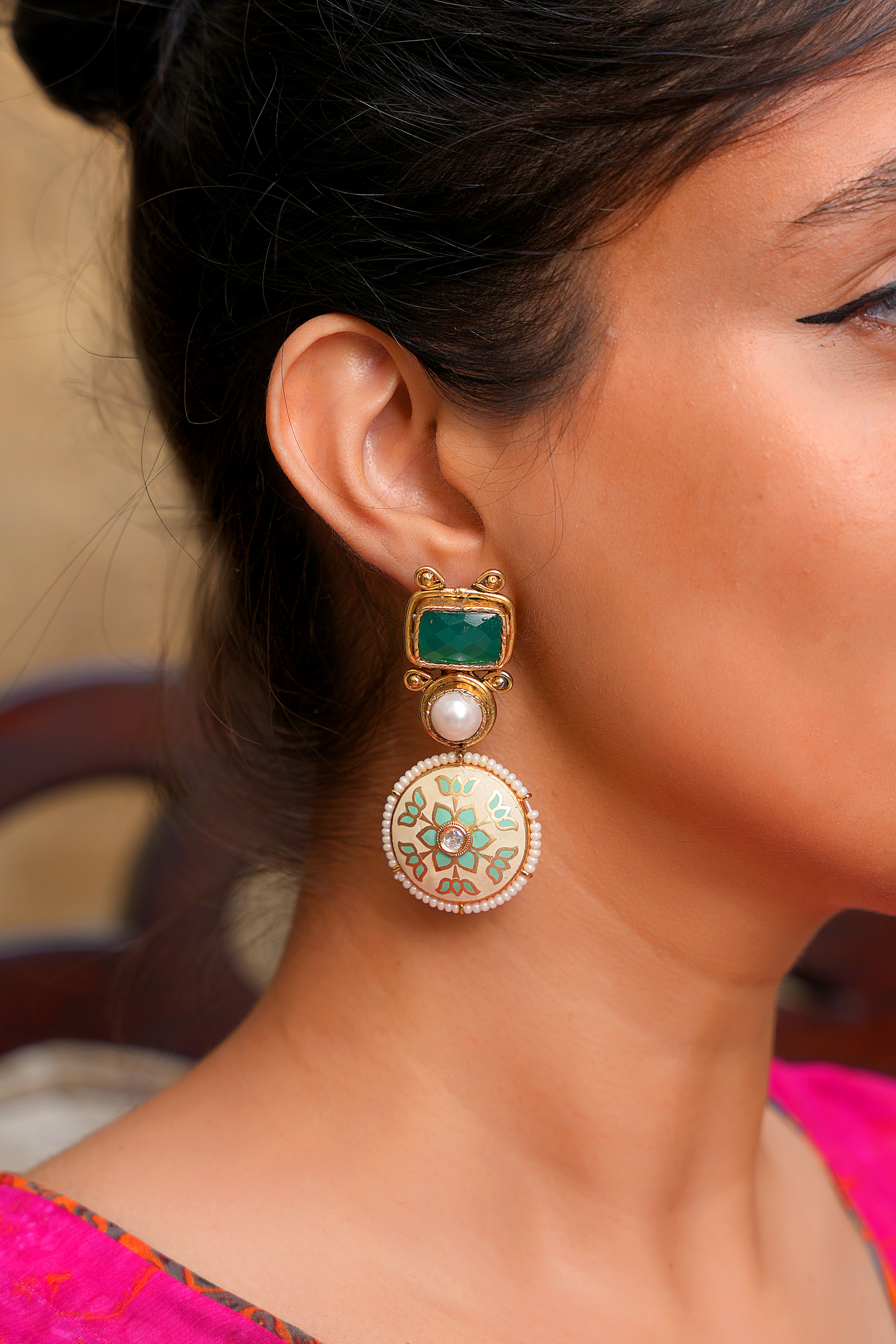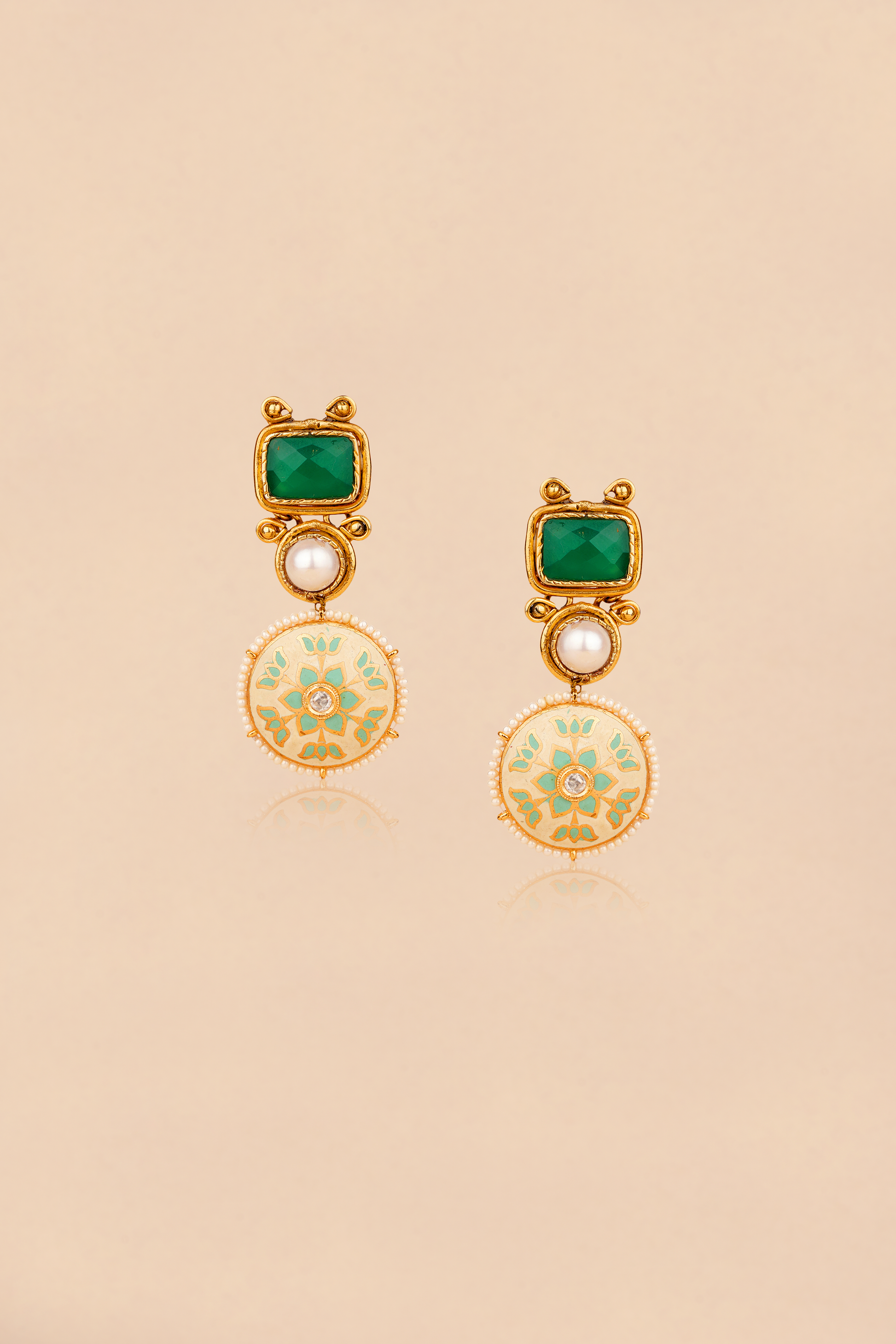 Gold plated Dangler Earrings with Agate, Pearls & Enamelled Disc hanging