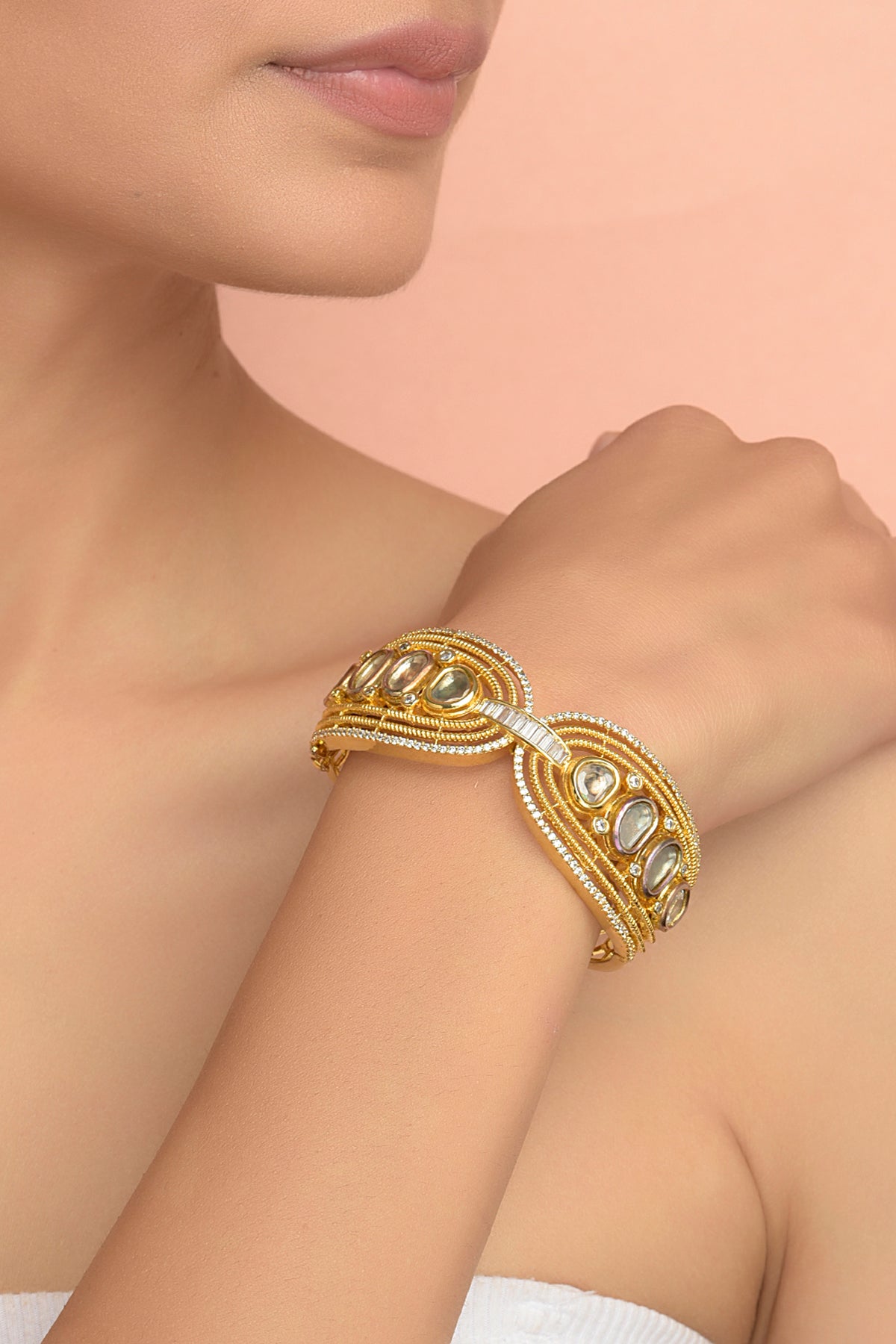 Featuring a gold plated bracelet studded with kundan polki and american diamonds