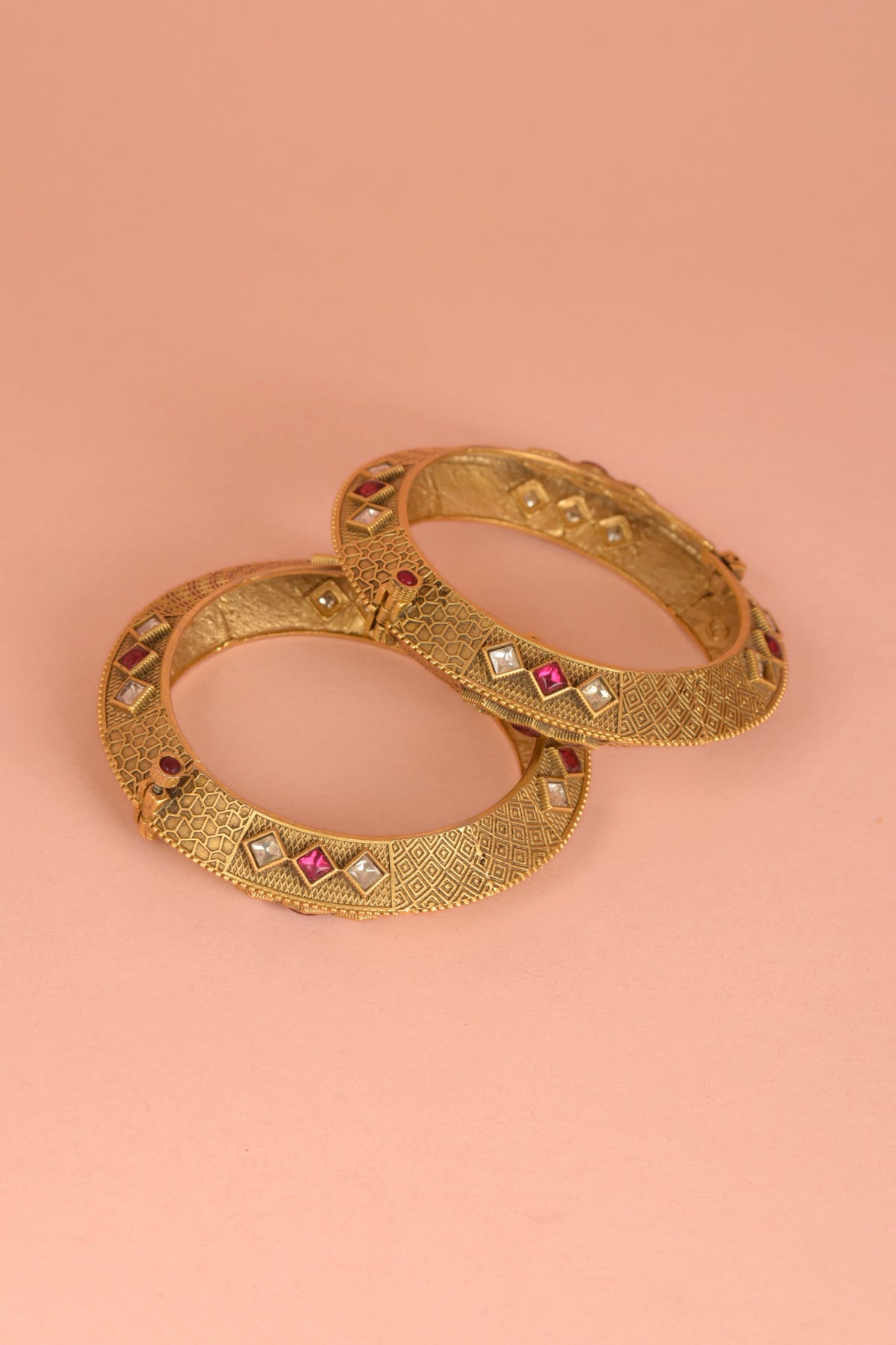 Featuring a pair of gold plated bangles studded with kundan polki. Perfect wear for festive occasions or wedding ceremonies.