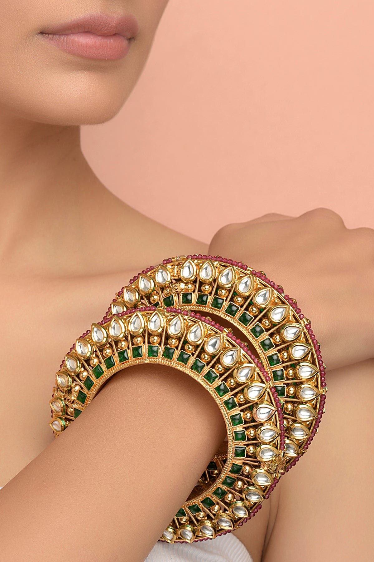 Featuring a pair of gold plated bracelets studded with kundan polki and green stones. Perfect wear for festive occasions or wedding ceremonies.