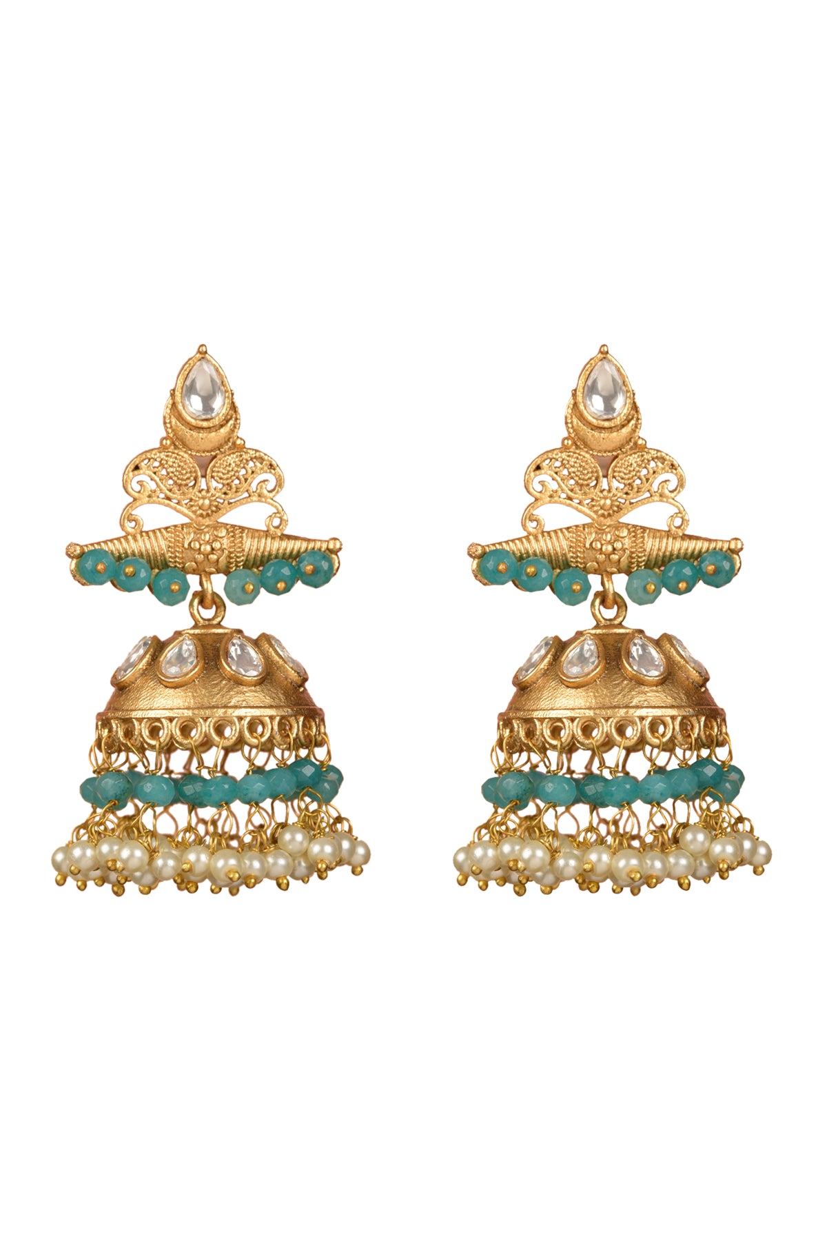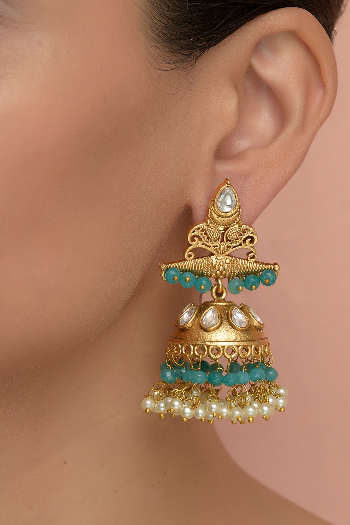Featuring a pair of gold plated jhumka earrings studded with turquoise stones and kundan polki