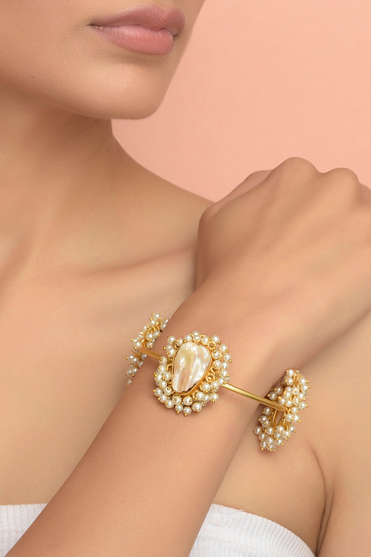 Featuring a gold plated bangle studded with Mother of pearls with hanging pearls