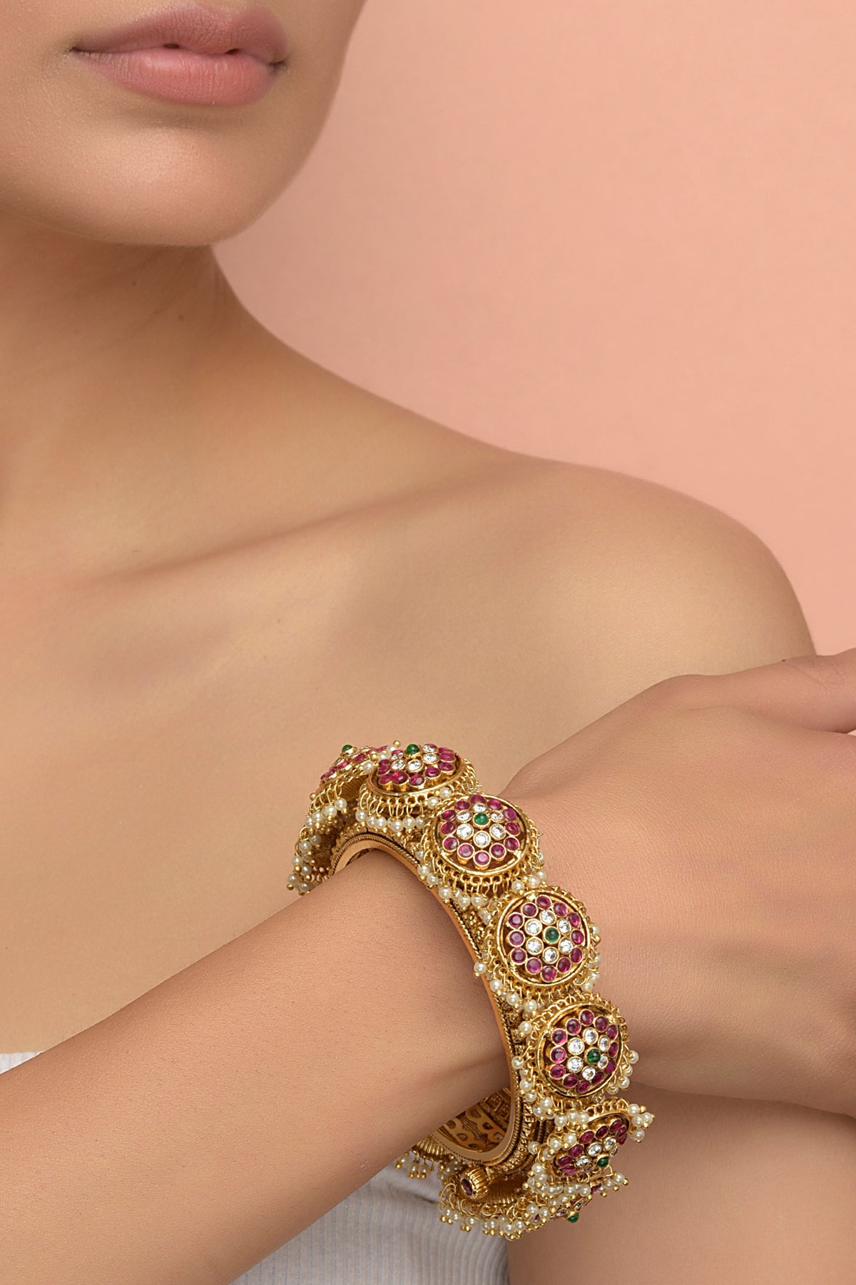 Featuring a gold plated bracelet studded Discs with ruby and pearls. Perfect wear for festive occasions or wedding ceremonies.