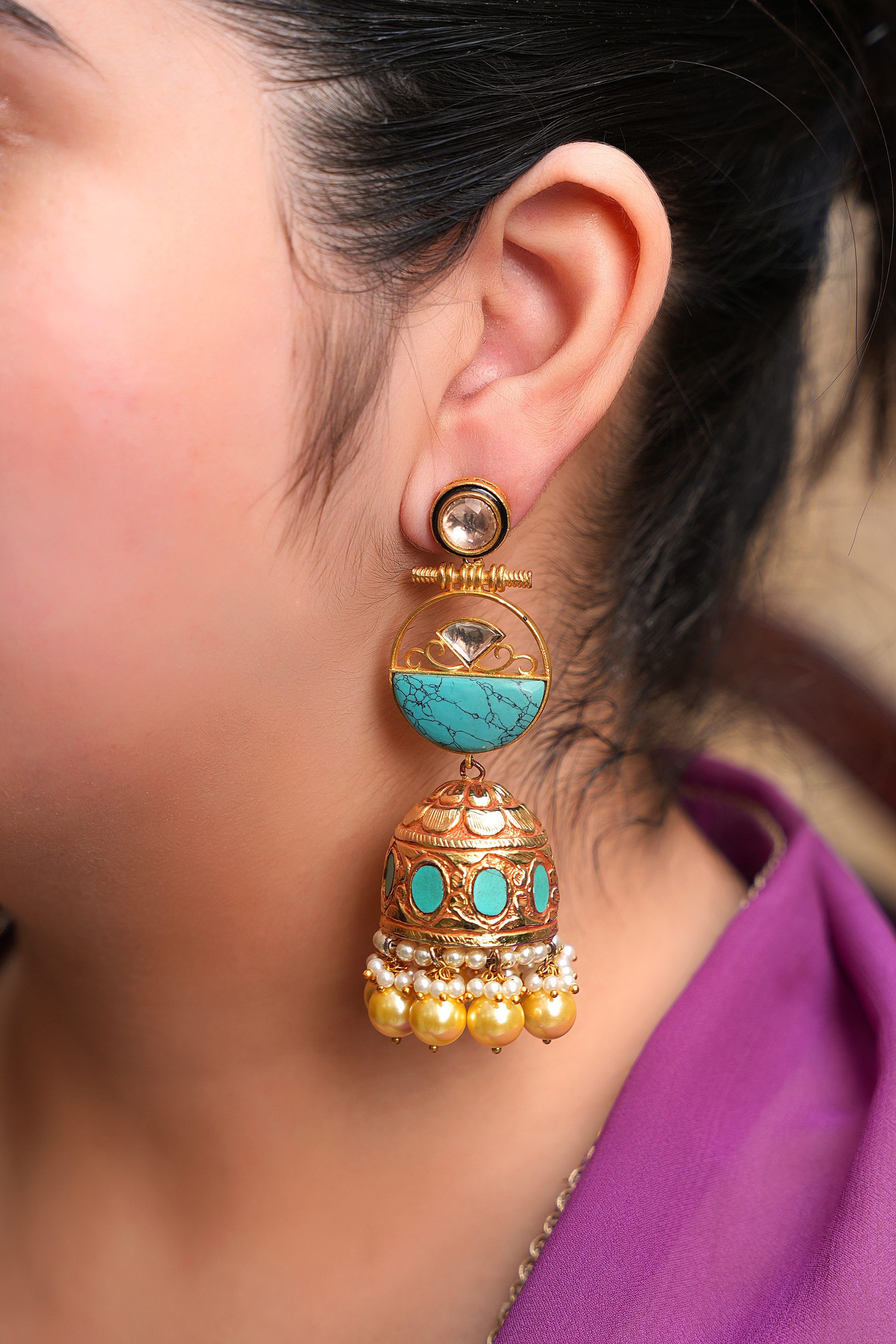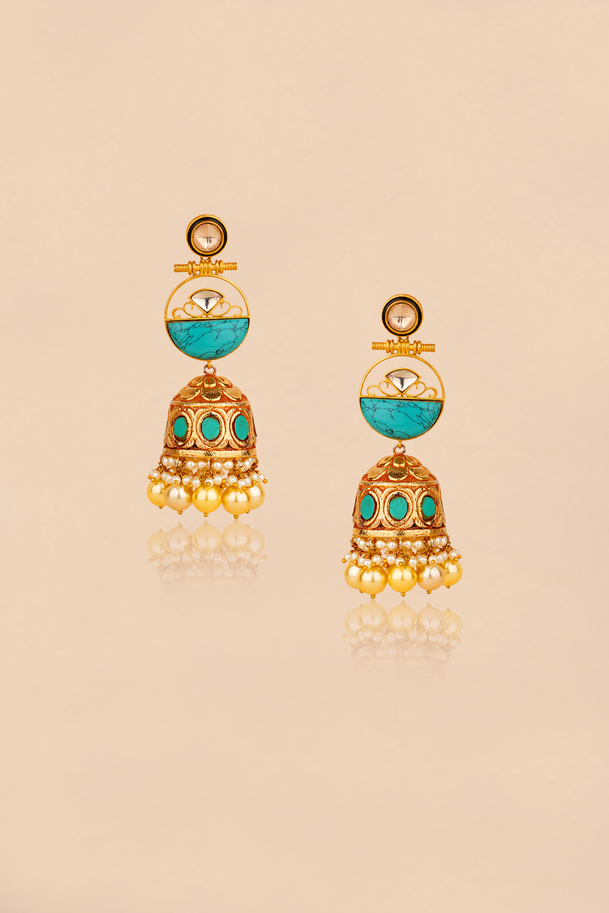 Featuring a pair of antique gold plated dangler earrings studded with a turquoise stone & a turquoise jhumki with pearl drops .